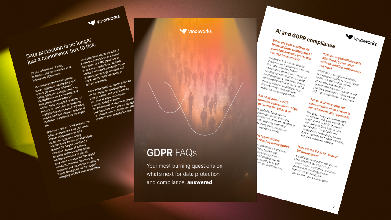 Download our comprehensive GDPR FAQ Guide, designed to clarify your most pressing data protection questions and help you navigate the complexities of compliance. Whether you’re new to GDPR or looking to update your processes, this guide provides clear answers to ensure you stay on track.